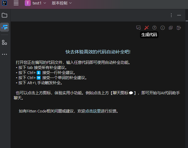 可在左侧 Fitten Code 工具栏中选择 "Fitten Code - 生成代码" ,如下图所示: