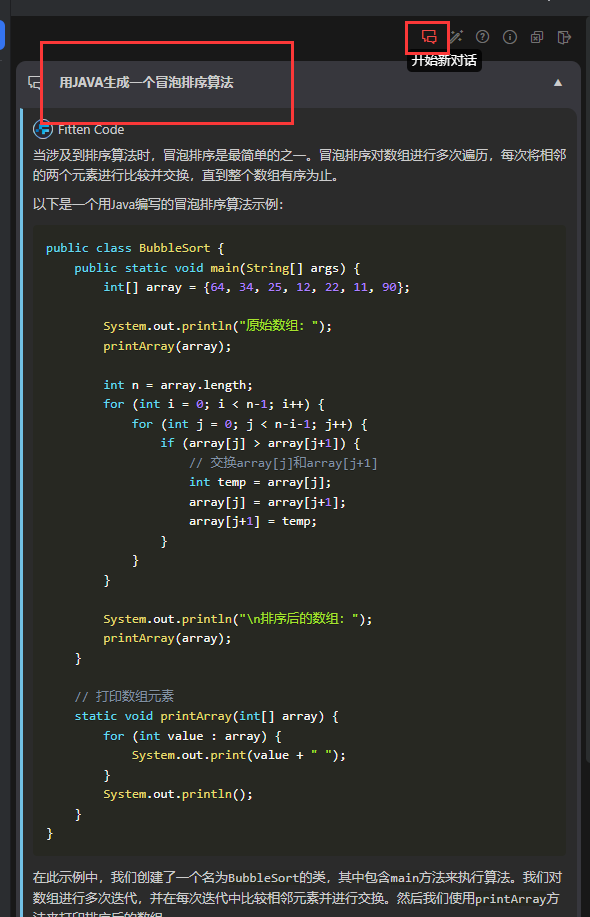 用户可通过点击左上角工具栏中的Fitten Code – 开始新对话打开对话窗口进行对话: