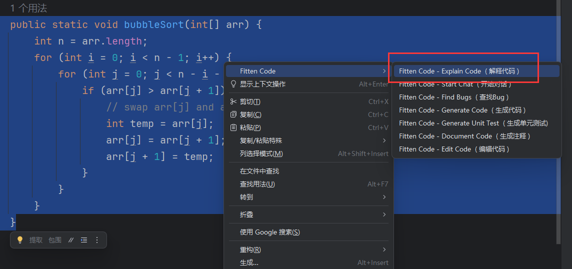 Fitten Code 可以对一段代码进行解释,可以通过选中代码段然后右键选择 "Fitten Code – 解释代码" 进行解释,如下图所示: