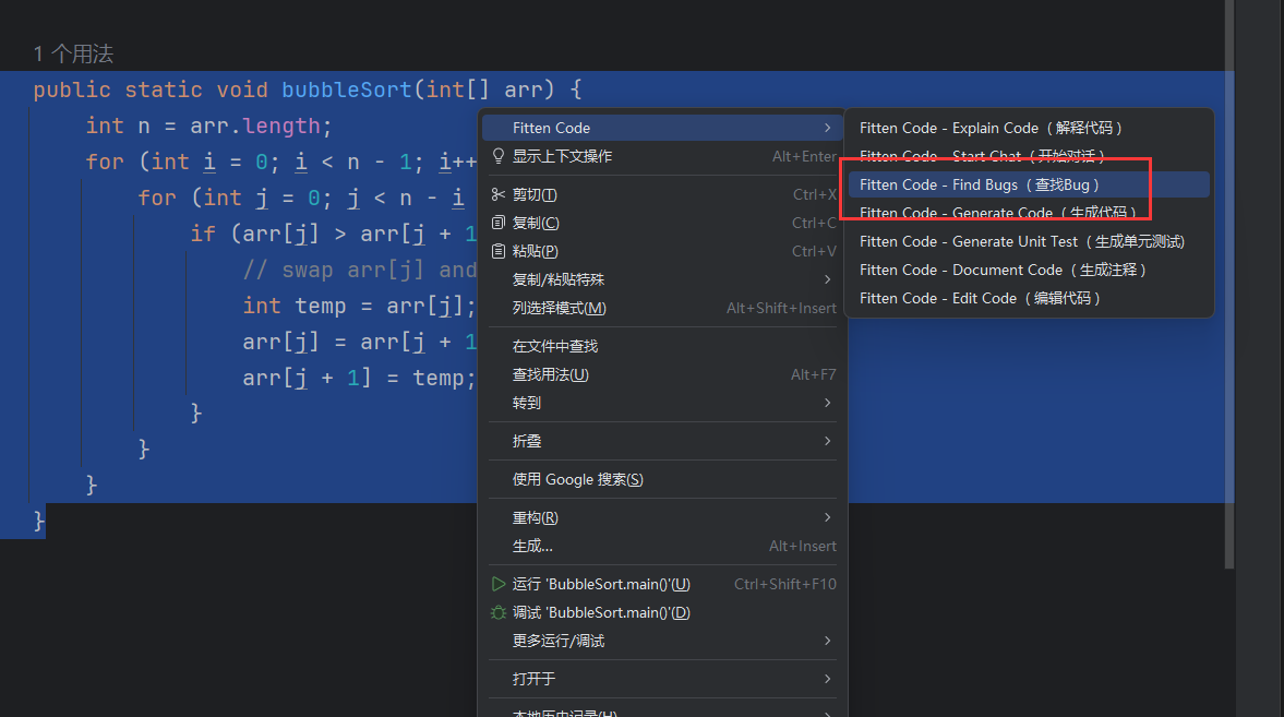 Fitten Code 可以对一段代码检查可能的 bug,并给出修复建议。选中对应代码段,然后右键选择 "Fitten Code查找Bug",如下图所示: