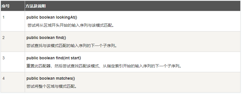 Matcher 对象是对输入字符串进行解释和匹配操作的引擎。与Pattern 类一样,Matcher 也没有公共构造方法。你需要调用 Pattern 对象的 matcher 方法来获得一个 Matcher 对象。