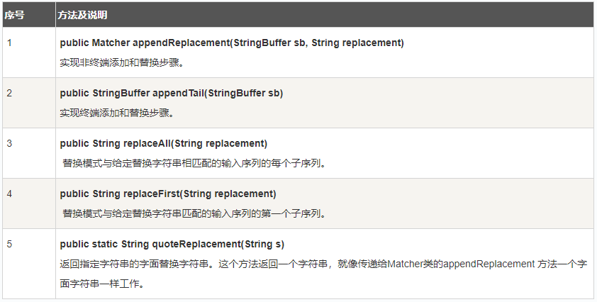 Matcher 类也提供了appendReplacement 和 appendTail 方法用于文本替换: