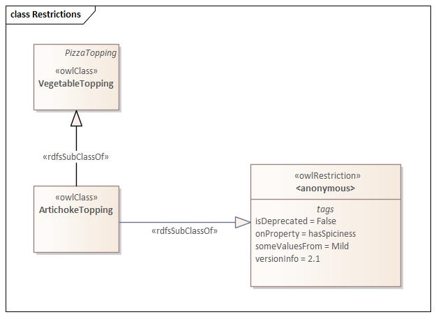 OWL 中的限制用于定义一个与 SQL 的 Where 子句类似的受限集合。它通过使用 onProperty 标签和诸如 allValuesFrom 或 someValuesFrom 这样的值约束来定义规则。Restriction 元素通常与 OWL 的其他关系(如 subClassOf)配合使用。例如,继续关于披萨配料的主题,对于“洋蓟配料类”:
