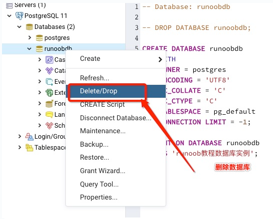 以上命令我们使用了超级用户 postgres 登录到主机地址为 localhost,端口号为 5432 的 PostgreSQL 数据库中并删除 runoobdb 数据库。