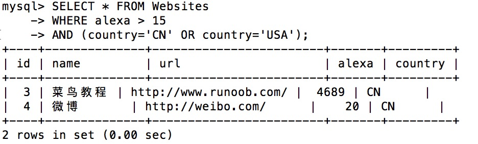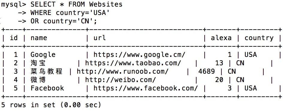 +----+--------------+---------------------------+-------+---------+ | id | name | url | alexa | country | +----+--------------+---------------------------+-------+---------+ | 1 | Google | https://www.google.cm/ | 1 | USA | | 2 | 淘宝 | https://www.taobao.com/ | 13 | CN | | 3 | 菜鸟教程 | http://www.runoob.com/ | 4689 | CN | | 4 | 微博 | http://weibo.com/ | 20 | CN | | 5 | Facebook | https://www.facebook.com/ | 3 | USA | +----+--------------+---------------------------+-------+---------+