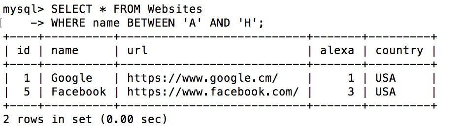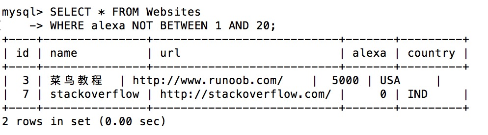 mysql> SELECT * FROM Websites; +----+---------------+---------------------------+-------+---------+ | id | name | url | alexa | country | +----+---------------+---------------------------+-------+---------+ | 1 | Google | https://www.google.cm/ | 1 | USA | | 2 | 淘宝 | https://www.taobao.com/ | 13 | CN | | 3 | 菜鸟教程 | http://www.runoob.com/ | 5000 | USA | | 4 | 微博 | http://weibo.com/ | 20 | CN | | 5 | Facebook | https://www.facebook.com/ | 3 | USA | | 7 | stackoverflow | http://stackoverflow.com/ | 0 | IND | +----+---------------+---------------------------+-------+---------+