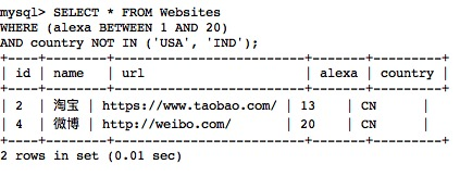 如需显示不在上面实例范围内的网站,请使用 NOT BETWEEN: