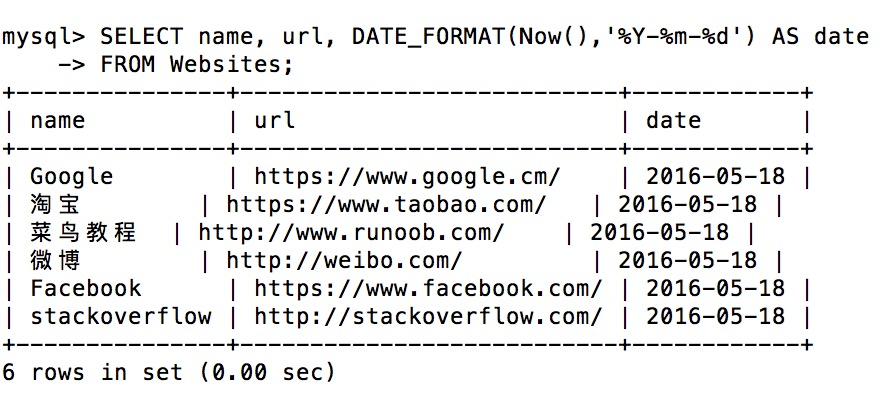 下面的 SQL 语句从 "Websites" 表中选取 name, url 以及格式化为 YYYY-MM-DD 的日期: