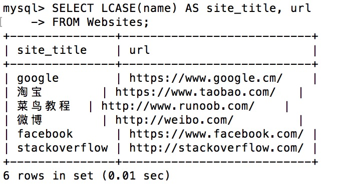 +----+--------------+---------------------------+-------+---------+ | id | name | url | alexa | country | +----+--------------+---------------------------+-------+---------+ | 1 | Google | https://www.google.cm/ | 1 | USA | | 2 | 淘宝 | https://www.taobao.com/ | 13 | CN | | 3 | 菜鸟教程 | http://www.runoob.com/ | 4689 | CN | | 4 | 微博 | http://weibo.com/ | 20 | CN | | 5 | Facebook | https://www.facebook.com/ | 3 | USA | | 7 | stackoverflow | http://stackoverflow.com/ | 0 | IND | +----+---------------+---------------------------+-------+---------+