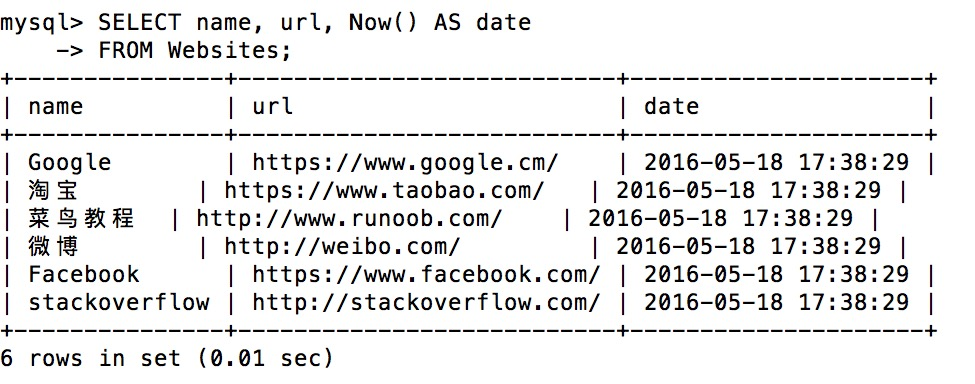 +----+--------------+---------------------------+-------+---------+ | id | name | url | alexa | country | +----+--------------+---------------------------+-------+---------+ | 1 | Google | https://www.google.cm/ | 1 | USA | | 2 | 淘宝 | https://www.taobao.com/ | 13 | CN | | 3 | 菜鸟教程 | http://www.runoob.com/ | 4689 | CN | | 4 | 微博 | http://weibo.com/ | 20 | CN | | 5 | Facebook | https://www.facebook.com/ | 3 | USA | | 7 | stackoverflow | http://stackoverflow.com/ | 0 | IND | +----+---------------+---------------------------+-------+---------+