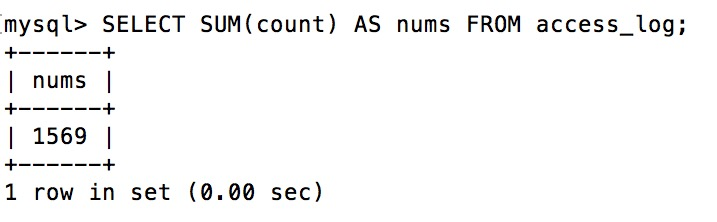 mysql> SELECT * FROM access_log; +-----+---------+-------+------------+ | aid | site_id | count | date | +-----+---------+-------+------------+ | 1 | 1 | 45 | 2016-05-10 | | 2 | 3 | 100 | 2016-05-13 | | 3 | 1 | 230 | 2016-05-14 | | 4 | 2 | 10 | 2016-05-14 | | 5 | 5 | 205 | 2016-05-14 | | 6 | 4 | 13 | 2016-05-15 | | 7 | 3 | 220 | 2016-05-15 | | 8 | 5 | 545 | 2016-05-16 | | 9 | 3 | 201 | 2016-05-17 | +-----+---------+-------+------------+ 9 rows in set (0.00 sec)