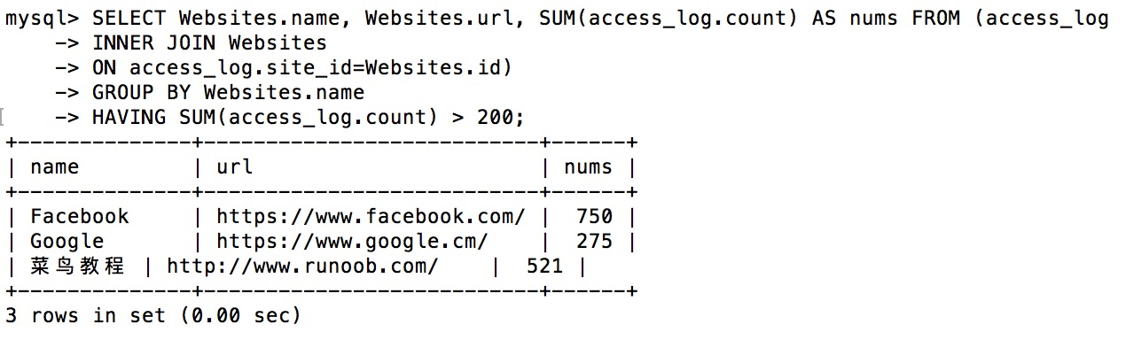 +----+--------------+---------------------------+-------+---------+ | id | name | url | alexa | country | +----+--------------+---------------------------+-------+---------+ | 1 | Google | https://www.google.cm/ | 1 | USA | | 2 | 淘宝 | https://www.taobao.com/ | 13 | CN | | 3 | 菜鸟教程 | http://www.runoob.com/ | 4689 | CN | | 4 | 微博 | http://weibo.com/ | 20 | CN | | 5 | Facebook | https://www.facebook.com/ | 3 | USA | | 7 | stackoverflow | http://stackoverflow.com/ | 0 | IND | +----+---------------+---------------------------+-------+---------+