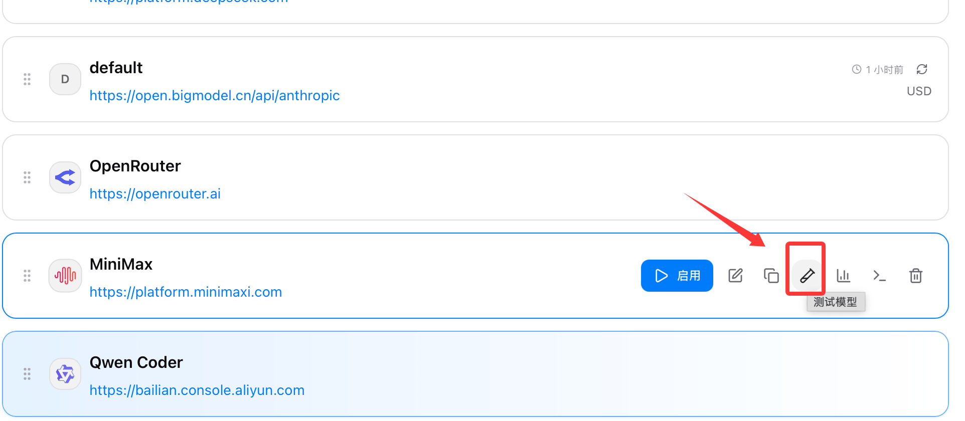 在列表中点击目标 Provider,再点击「启用」,CC Switch 会自动将配置写入对应 CLI 工具的配置文件: