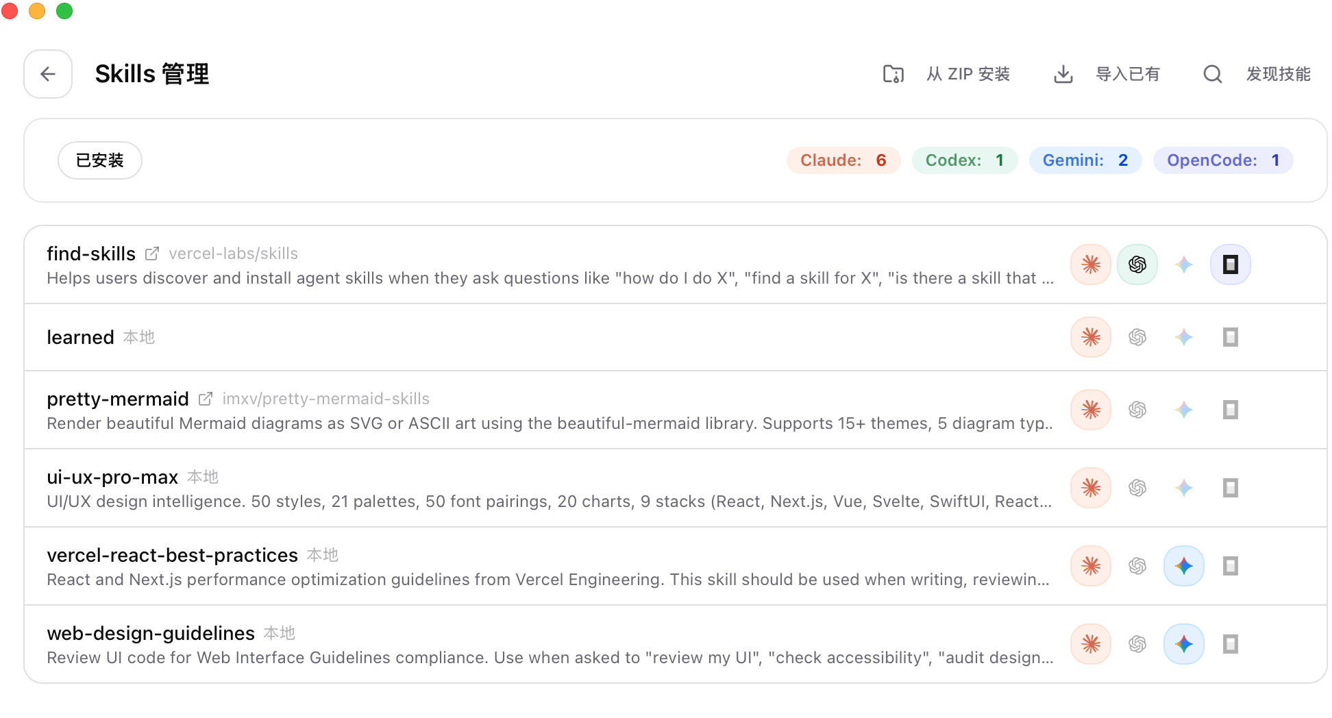 在「MCP」面板中,可视化添加、编辑和删除 MCP(Model Context Protocol)服务器。配置自动同步到对应 CLI 工具,支持从已安装的应用一键导入现有 MCP 配置。