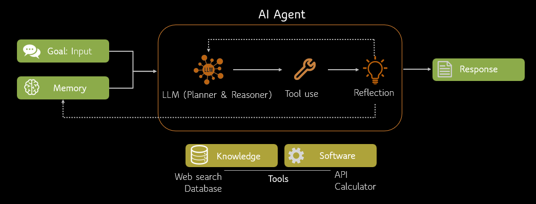 Agent = LLM (大脑) + Planning (规划) + Tool use (执行) + Memory (记忆)。