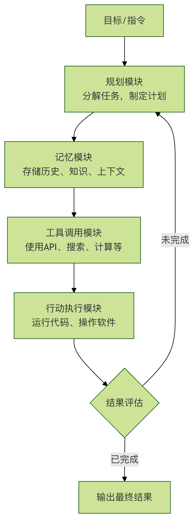 一个功能完整的 AI Agent 通常模仿人类的认知和行动循环,包含以下几个关键模块: