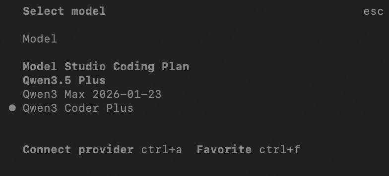 在命令行输入 /models,输入 Model Studio Coding Plan 进行搜索,选择模型后即可使用。