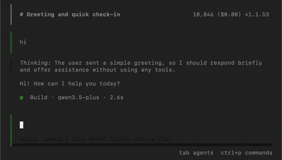{ "$schema": "https://opencode.ai/config.json", "provider": { "bailian-coding-plan": { "npm": "@ai-sdk/anthropic", "name": "Model Studio Coding Plan", "options": { "baseURL": "https://coding.dashscope. aliyuncs.com/apps/anthropic/v1", "apiKey": "YOUR_API_KEY" }, "models": { "qwen3.5-plus": { "name": "Qwen3.5 Plus", "modalities": { "input": ["text", "image"], "output": ["text"] }, "options": { "thinking": { "type": "enabled", "budgetTokens": 8192 } }, "limit": { "context": 1000000, "output": 65536 } }, "qwen3-max-2026-01-23": { "name": "Qwen3 Max 2026-01-23", "modalities": { "input": ["text"], "output": ["text"] }, "limit": { "context": 262144, "output": 32768 } }, "qwen3-coder-next": { "name": "Qwen3 Coder Next", "modalities": { "input": ["text"], "output": ["text"] }, "limit": { "context": 262144, "output": 65536 } }, "qwen3-coder-plus": { "name": "Qwen3 Coder Plus", "modalities": { "input": ["text"], "output": ["text"] }, "limit": { "context": 1000000, "output": 65536 } }, "MiniMax-M2.5": { "name": "MiniMax M2.5", "modalities": { "input": ["text"], "output": ["text"] }, "options": { "thinking": { "type": "enabled", "budgetTokens": 8192 } }, "limit": { "context": 204800, "output": 131072 } }, "glm-5": { "name": "GLM-5", "modalities": { "input": ["text"], "output": ["text"] }, "options": { "thinking": { "type": "enabled", "budgetTokens": 8192 } }, "limit": { "context": 202752, "output": 16384 } }, "glm-4.7": { "name": "GLM-4.7", "modalities": { "input": ["text"], "output": ["text"] }, "options": { "thinking": { "type": "enabled", "budgetTokens": 8192 } }, "limit": { "context": 202752, "output": 16384 } }, "kimi-k2.5": { "name": "Kimi K2.5", "modalities": { "input": ["text", "image"], "output": ["text"] }, "options": { "thinking": { "type": "enabled", "budgetTokens": 8192 } }, "limit": { "context": 262144, "output": 32768 } } } } } }