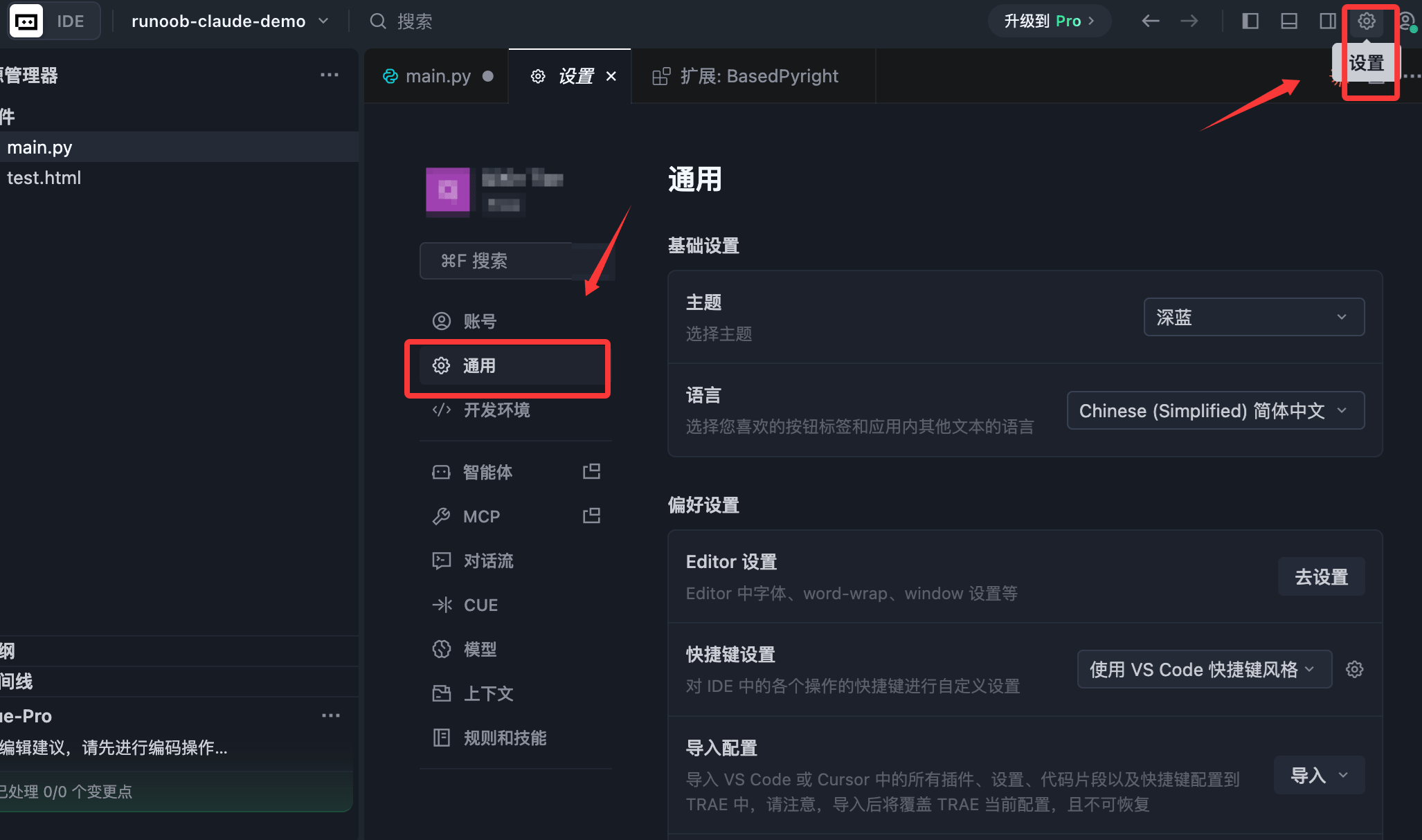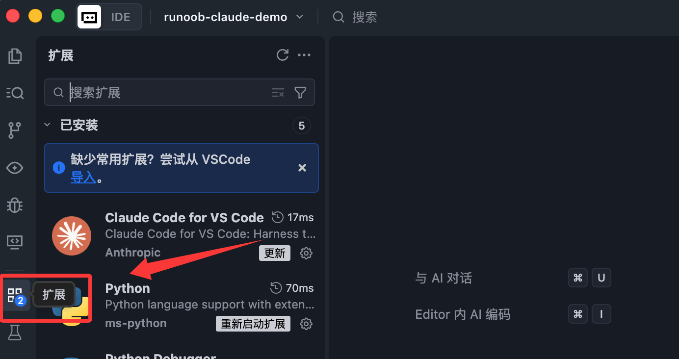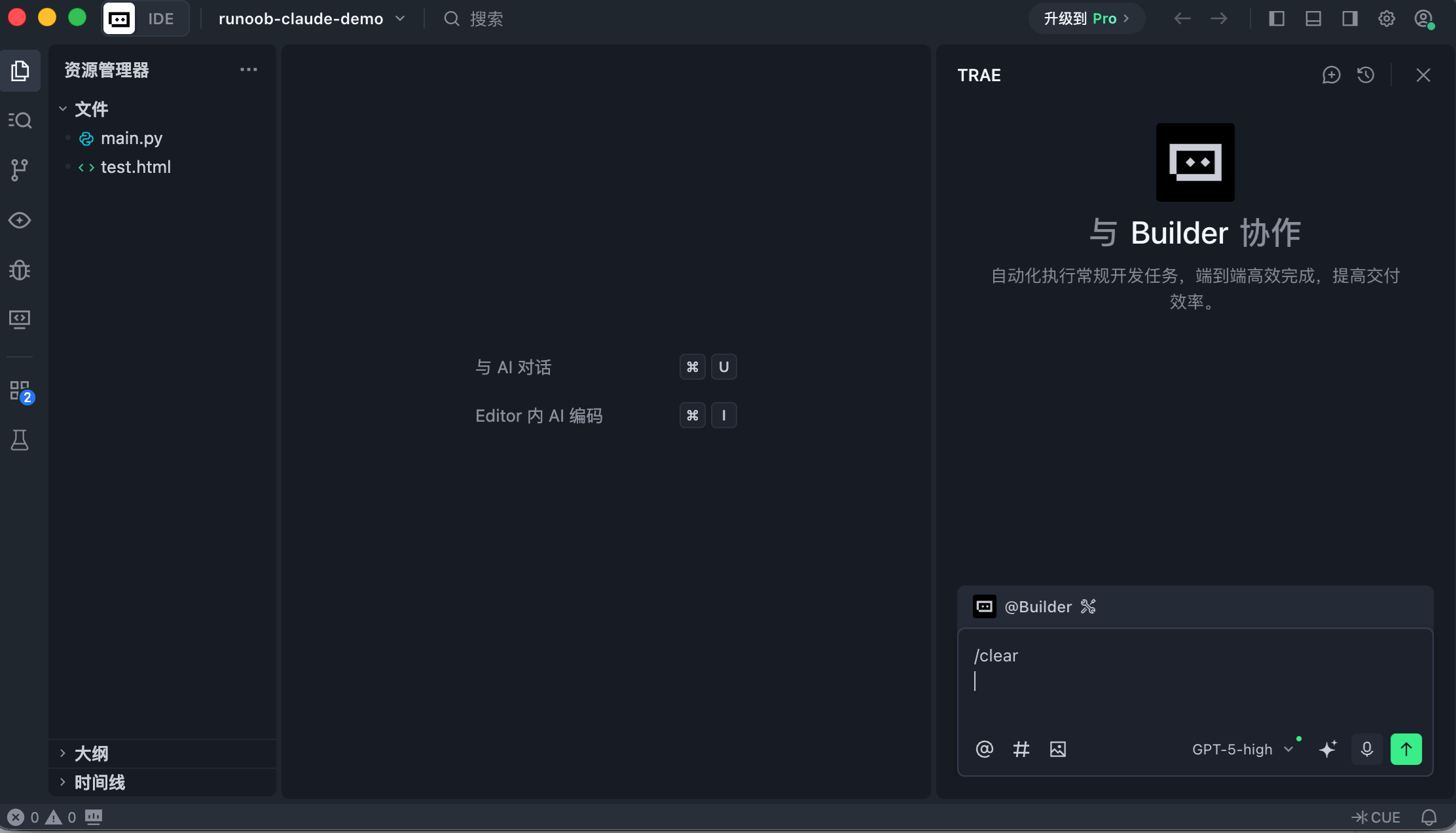 trae ~/runoob-test # 打开指定目录的项目