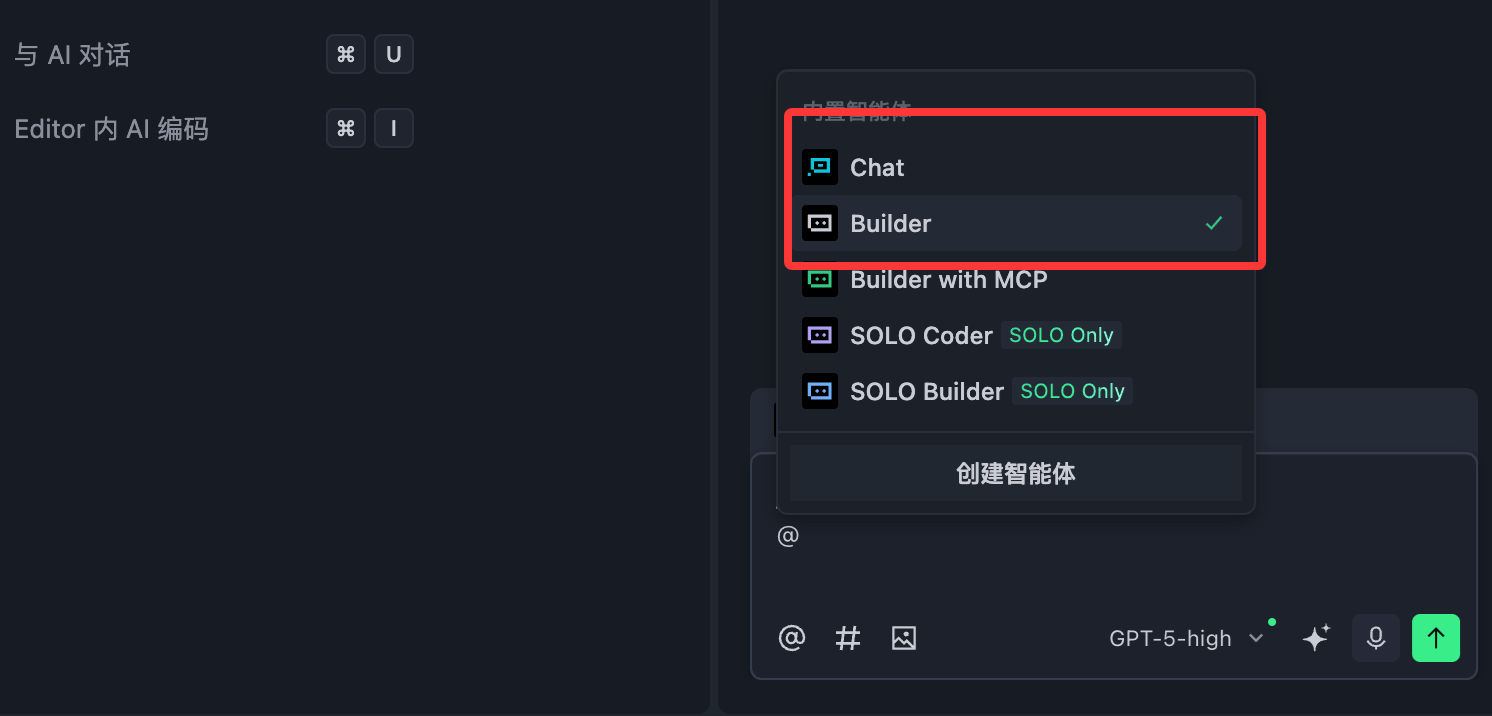 AI 助手面板:右侧的 AI 交互区域,支持 Chat 和 Builder 两种模式