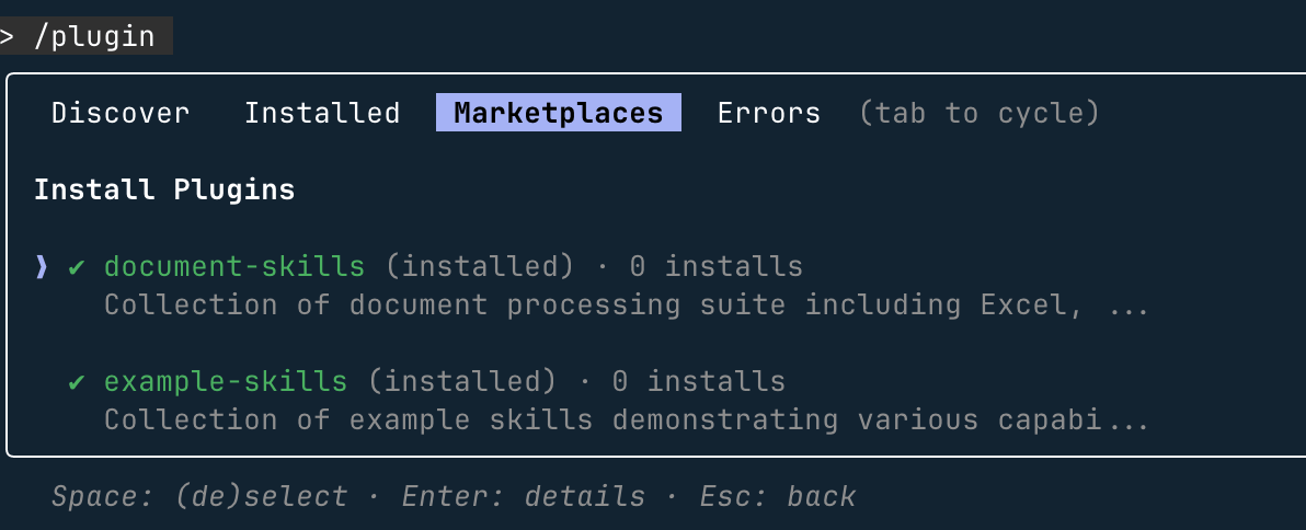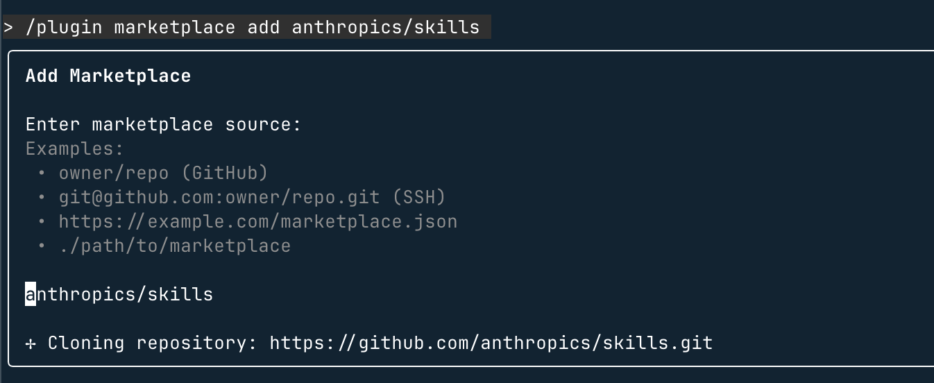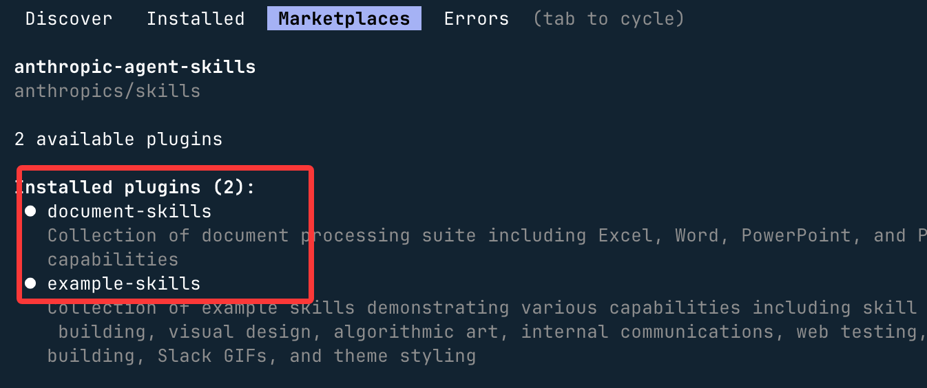 /plugin install document-skills@anthropic-agent-skills /plugin install example-skills@anthropic-agent-skills