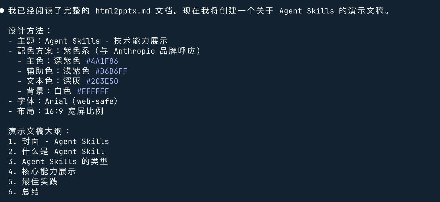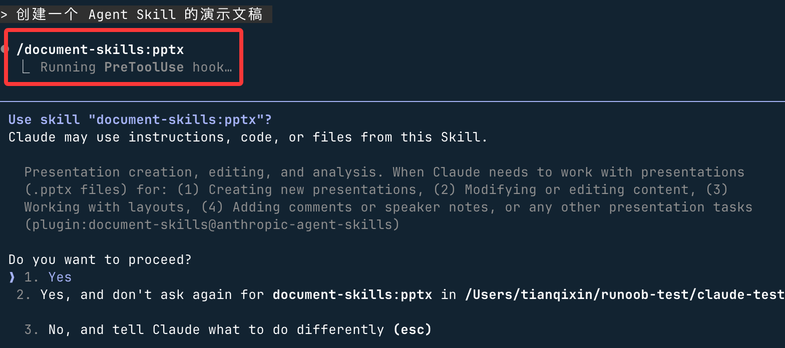 使用的时候只需在指令中提及技能名称即可调用,例如安装 document-skills 插件后,可向 Claude Code 下达指令:
