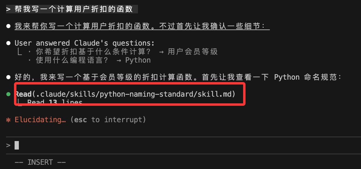 Claude 就会会扫描已安装的 Skills,发现你的请求涉及 "Python 代码编写",匹配了 python-naming-standard。
