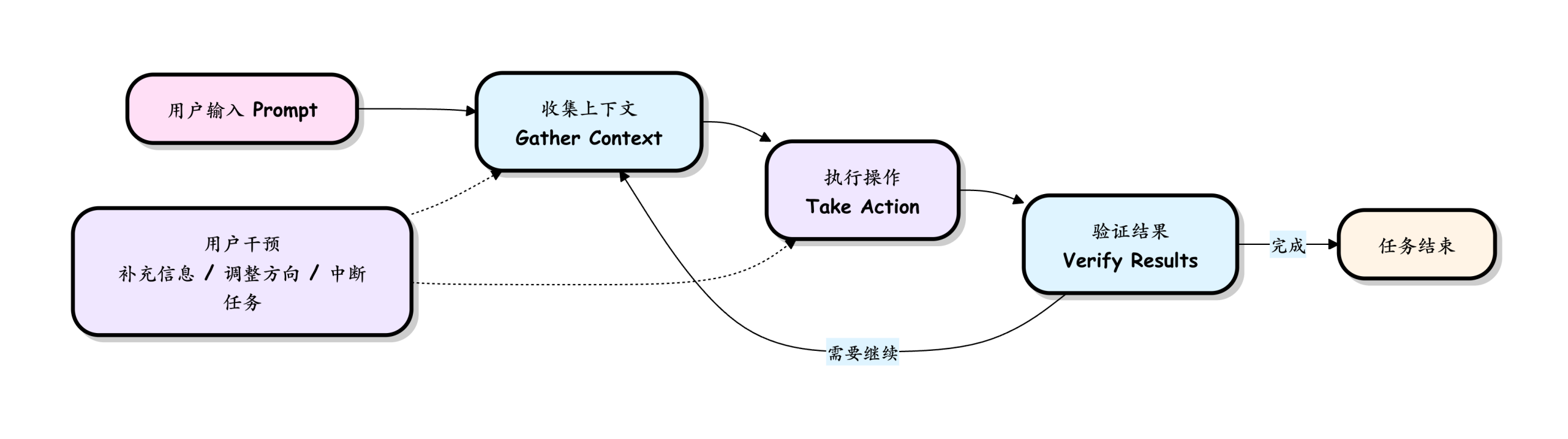 Prompt → 获取上下文 → 执行动作 → 验证结果 →(循环)→ 完成