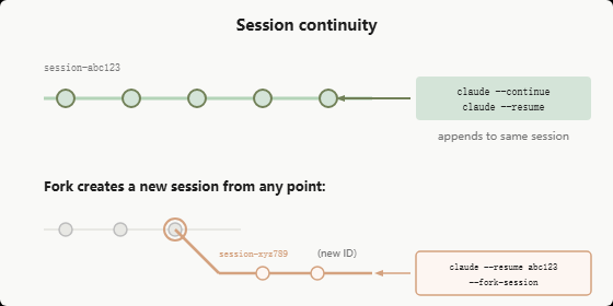 Claude Code 支持三种灵活的会话操作,让你随时接上之前的进度或尝试不同方案: