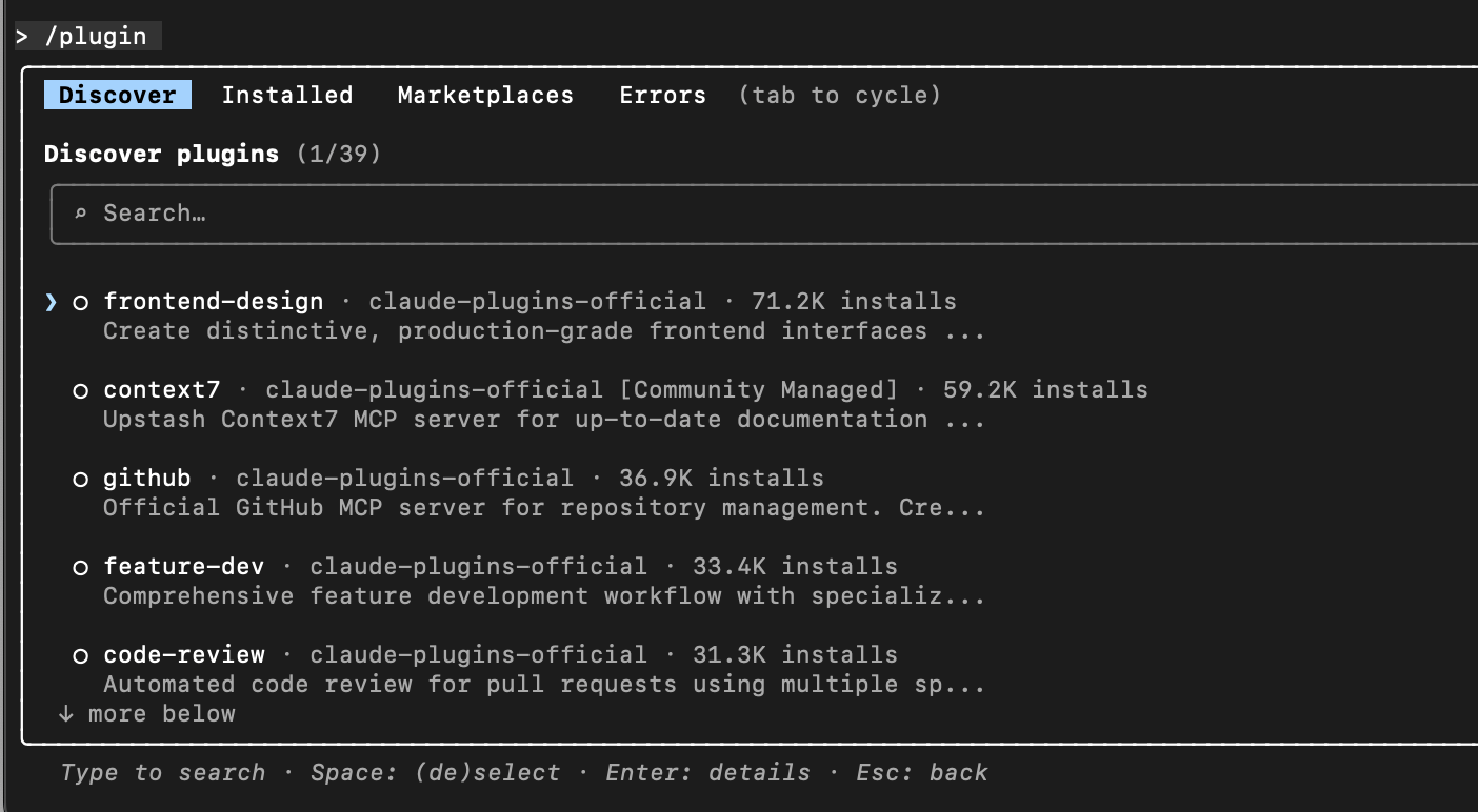 /plugin # 打开插件管理器 /plugin install # 安装插件 /plugin uninstall # 卸载 /plugin enable/disable # 启用 / 禁用 /plugin marketplace add # 添加市场 /plugin marketplace rm # 移除市场