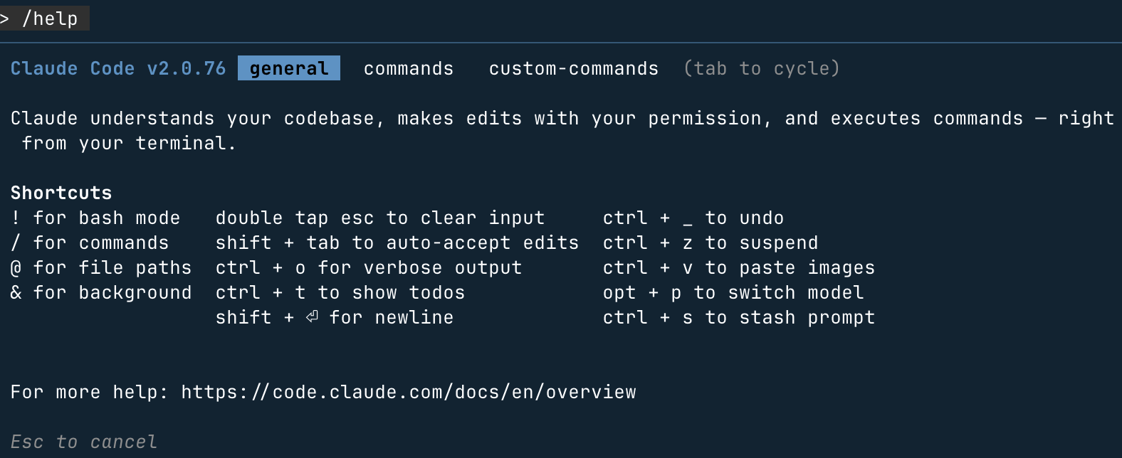 例如我们使用 /help 命令查看帮助信息, Tab 键可以切换菜单, Esc 退出: