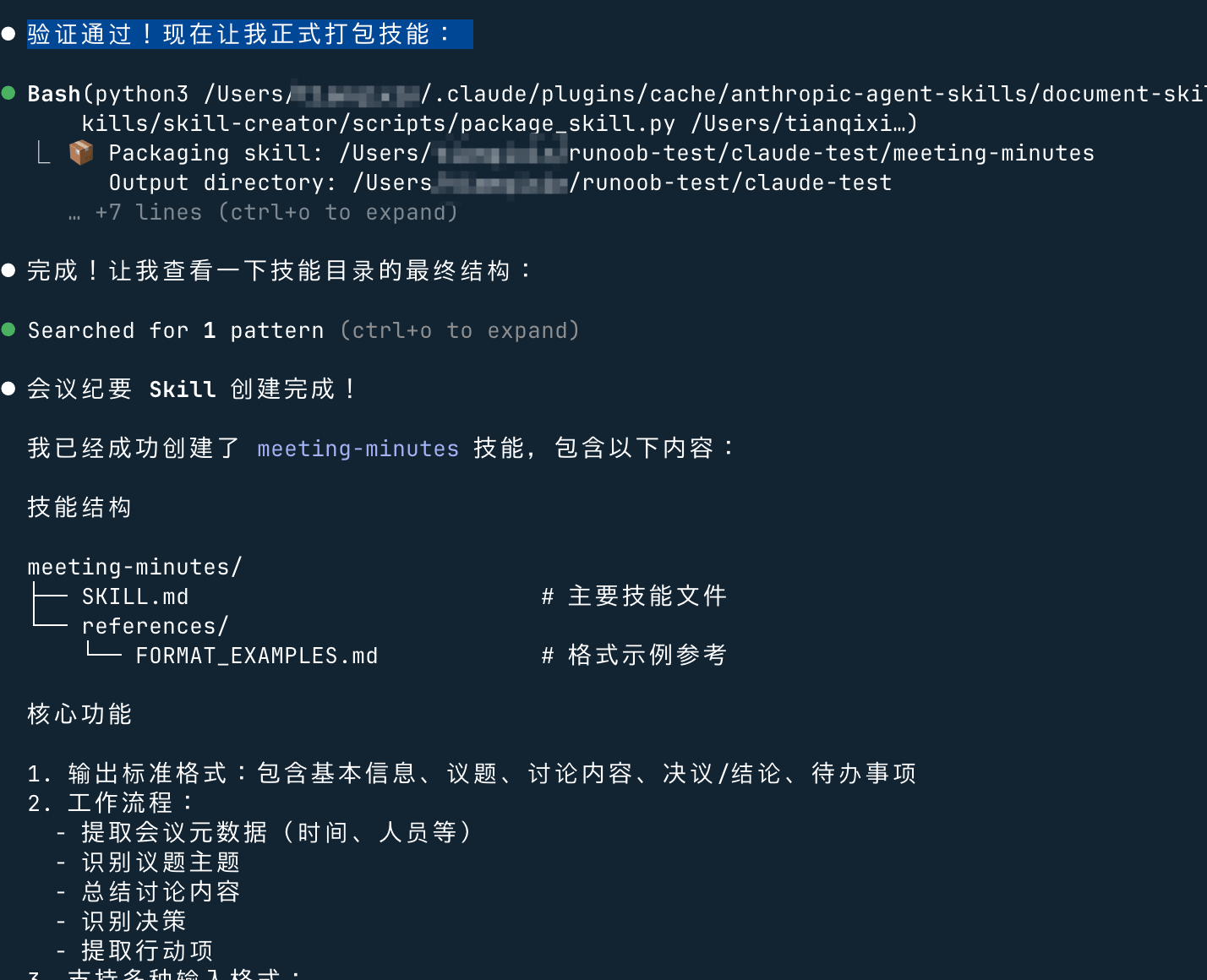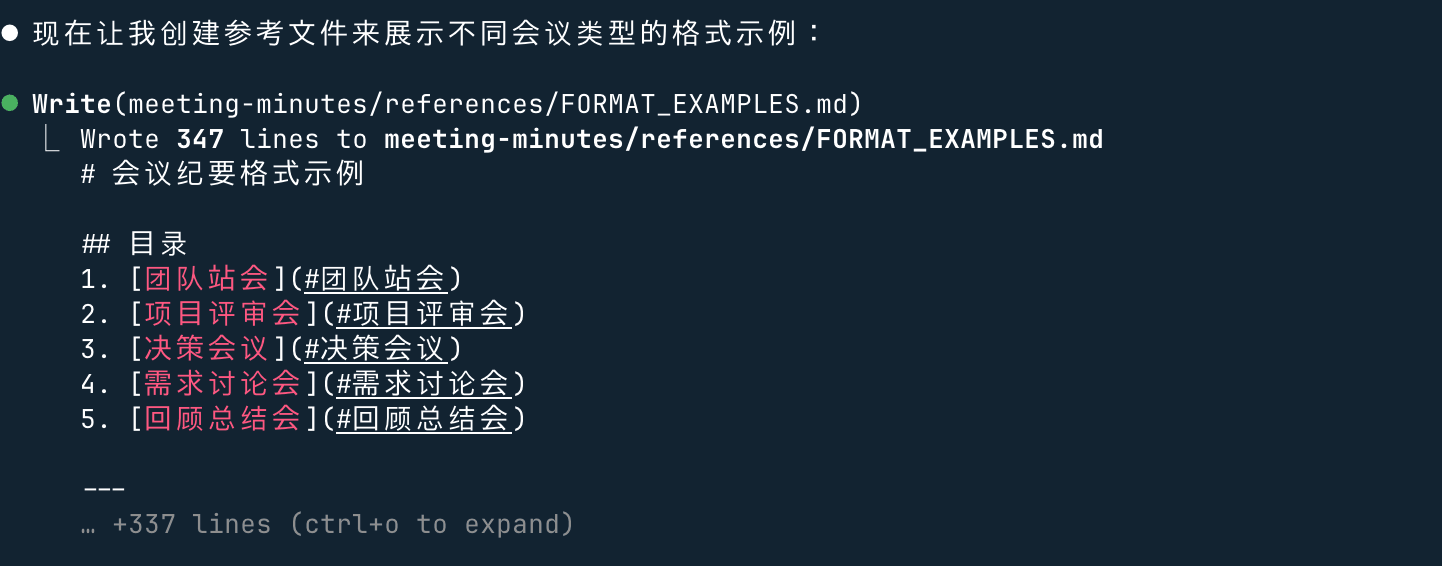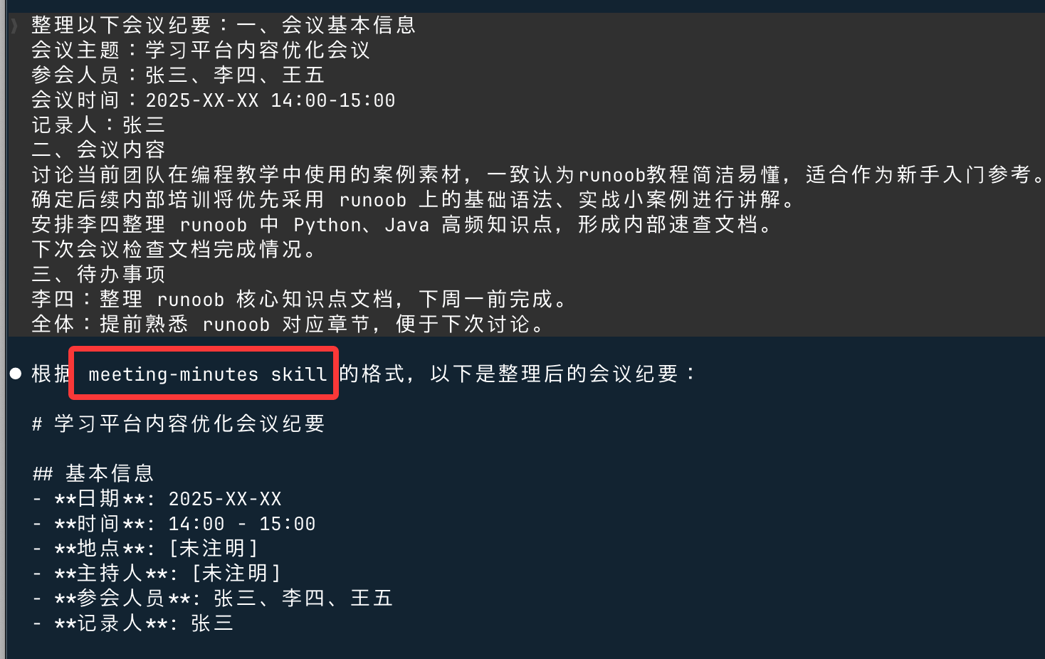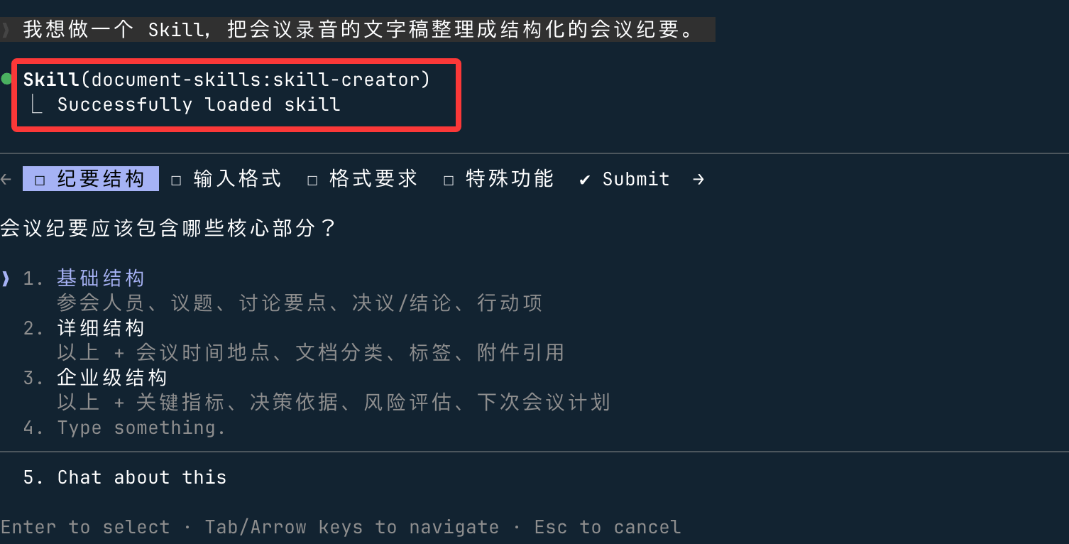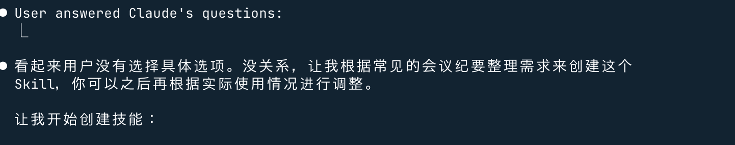 你:我想做一个 Skill,把会议录音的文字稿整理成结构化的会议纪要。 Claude:好的,我来问几个问题帮你确认需求: 1. 纪要里需要包含哪些内容?(比如:时间、参与人、决议、行动事项……) 2. 输出格式是 Word 文档、Markdown,还是直接在对话里回复? 3. 有没有固定的纪要模板? 你:需要包含会议主题、时间、参与人、讨论要点、决议事项、 下一步行动(含负责人和截止日期)。 输出 Word 文档。 有模板,我来上传。