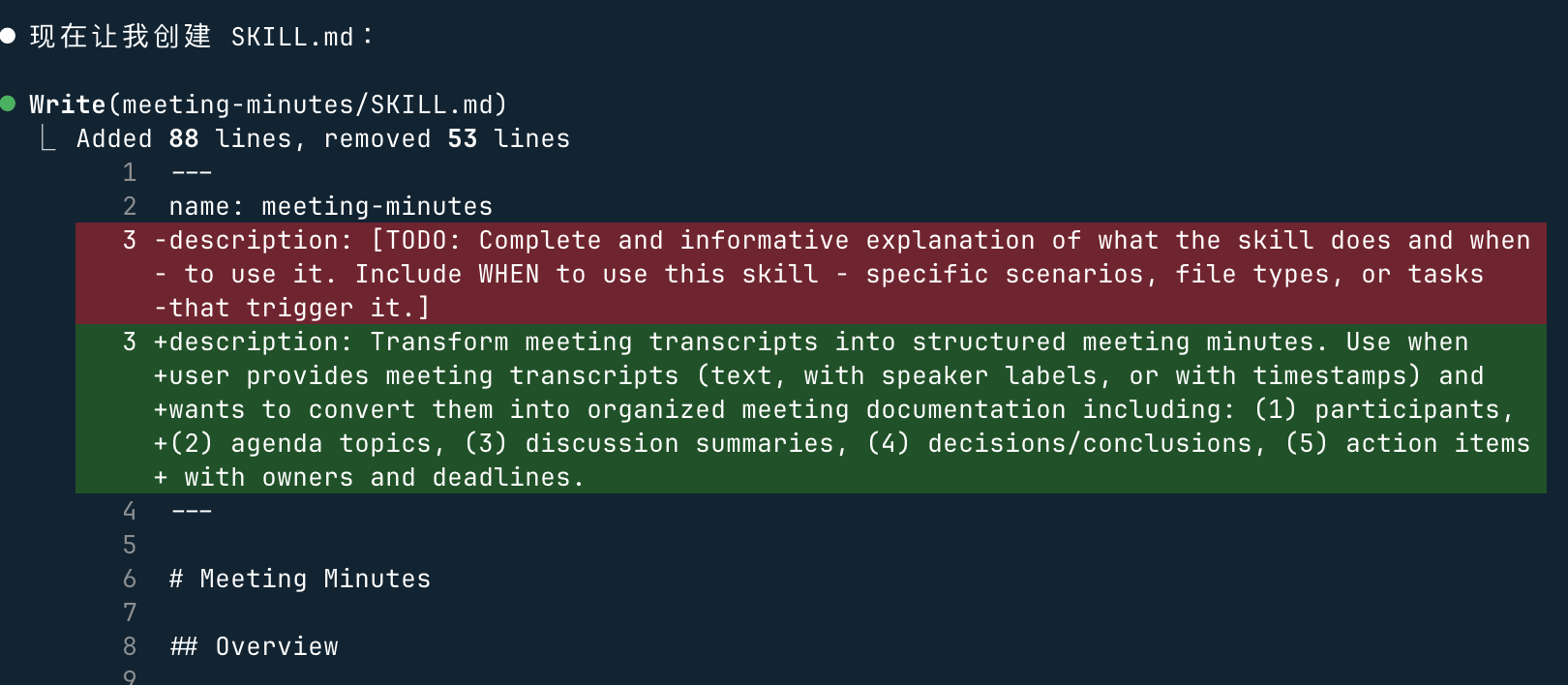 之后 Claude 会写出 SKILL.md 草稿,大致长这样: