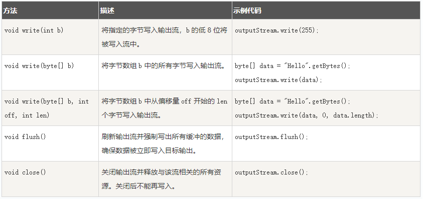 创建 OutputStream 对象完成后,就可以使用下面的方法来写入流或者进行其他的流操作。