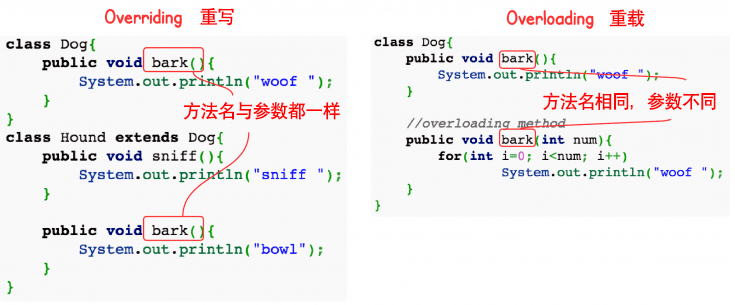 (2)方法重写是在子类存在方法与父类的方法的名字相同,而且参数的个数与类型一样,返回值也一样的方法,就称为重写(Overriding)。