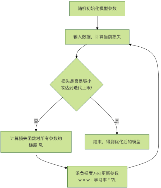 它们之间的关系链是 : 模型做出预测 → 损失函数计算误差 → 计算误差相对于各参数的梯度 → 沿负梯度方向更新参数 → 模型改进 → 重复...