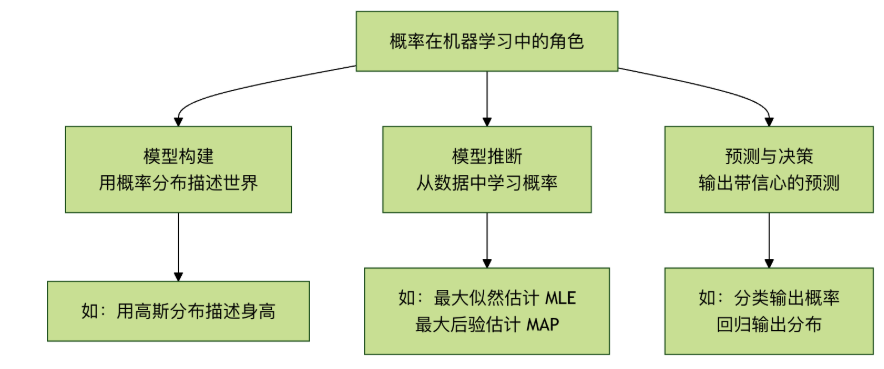 概率思维渗透在机器学习的各个环节,主要扮演以下三种角色: