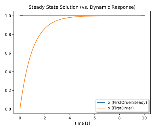 modelFirstOrderSteady"First order equation with steady state initial condition"Realx"State variable";initialequationder(x)=0"Initialize the system in steady state";equationder(x)=1-x"Drives value of x toward 1.0";endFirstOrderSteady;