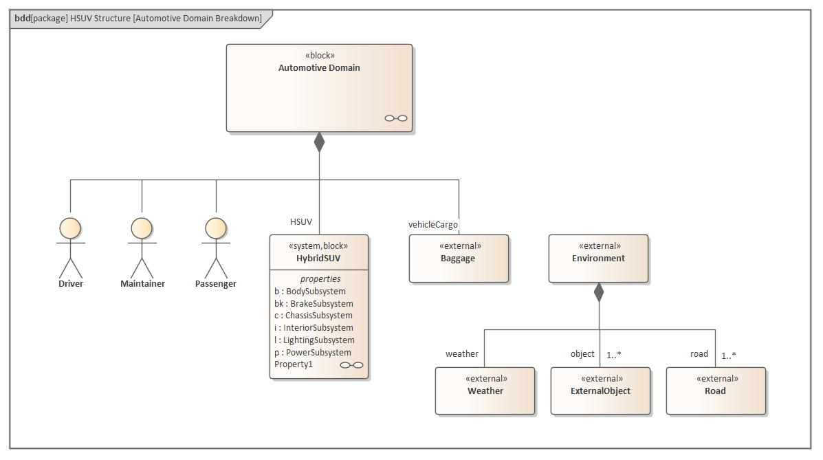 该示例 SysML 块 图可在 Enterprise 架构师示例模型中的系统工程范例中找到>SysML 1.5 示例:HSUV >建模领域 > HSUV 模型> HSUV 结构。