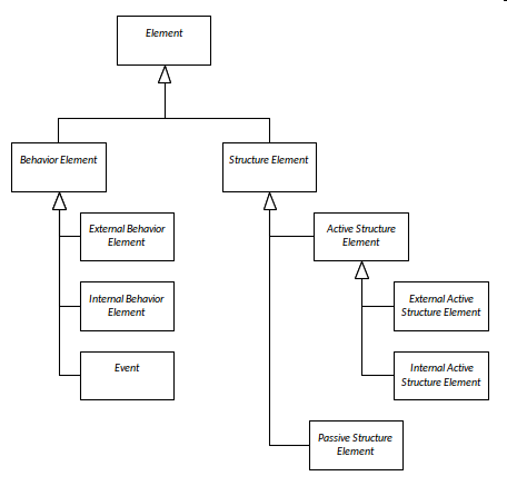 下图展示了 ArchiMate 语言中行为和结构元素的主要层级结构。该模型中的所有元素都以斜体显示,这表明它们是抽象的,本身并不参与模型构建。它们被视为与框架的各层无关,因为它们可以在所有层中应用。该语言元素的基本划分是分为行为元素和结构元素。