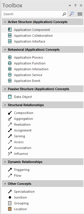 诸如“应用程序组件”(这是一种“活动结构”元素的类型)和“应用程序流程”(这是一种“行为”元素的类型)等元素被添加到架构模型中。