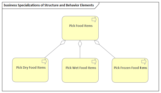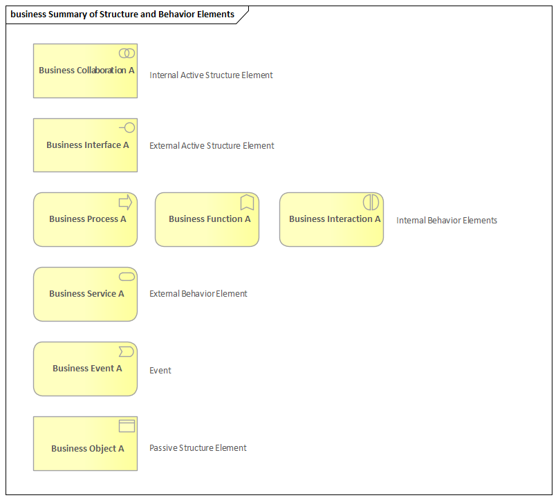 ArchiMate 语言中行为和结构元素的主要层级结构在 Enterprise Architect 中得以实现。行为元素类似于自然语言中的动词,而结构元素则类似于名词。