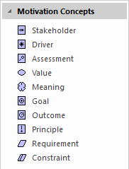 “动机”这一方面使用户能够创建驱动企业运营并设计企业运作方式的各种力量的模型。Enterprise Architect 提供了一系列此类动机元素的组合,包括利益相关者、价值、意义、驱动因素、评估、目标、结果、原则和需求,其中也包括其子类型“约束”。
