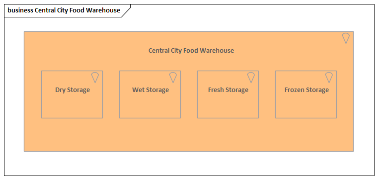 Enterprise Architect 实现了 Archimate 复合元素,并允许这些元素被聚合或组合其他复合元素。例如,架构师可以将一个大型仓库设施建模为一个地点,并创建代表包含位置内特定库存位置的组合位置。