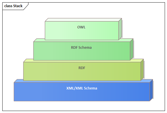 网络本体语言 OWL 提供了一种表示知识以及描述分类体系和分类图谱的方法。名词(顶点)代表对象的类别,动词(边)则模拟对象之间的关系或联系。OWL 语言是这一层次结构中的最顶层元素,它基于 W3C 的模式定义语言资源描述框架模式(RDFS),后者是对基本的元数据标记语言资源描述框架(RDF)的专门化。
