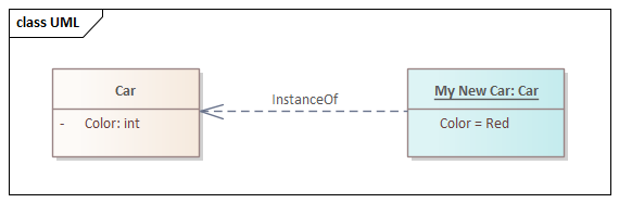 在 UML 类图中,建模人员会将这一概念表示为一个名为“汽车”的类,并添加一个名为“颜色”的属性。该类的一个实例(对象)可以将“颜色”属性的值设为“红色”。
