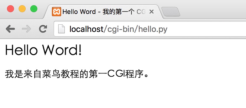 这个的hello.py脚本是一个简单的Python脚本,脚本第一行的输出内容"Content-type:text/html"发送到浏览器并告知浏览器显示的内容类型为"text/html"。