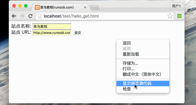 以下是一个通过HTML的表单使用GET方法向服务器发送两个数据,提交的服务器脚本同样是hello_get.py文件,hello_get.html 代码如下: