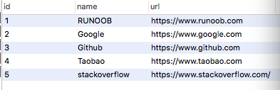 (3, 'Github', 'https://www.github.com') (2, 'Google', 'https://www.google.com') (1, 'RUNOOB', 'https://www.runoob.com') (5, 'stackoverflow', 'https://www.stackoverflow.com/') (4, 'Taobao', 'https://www.taobao.com') (6, 'Zhihu', 'https://www.zhihu.com')