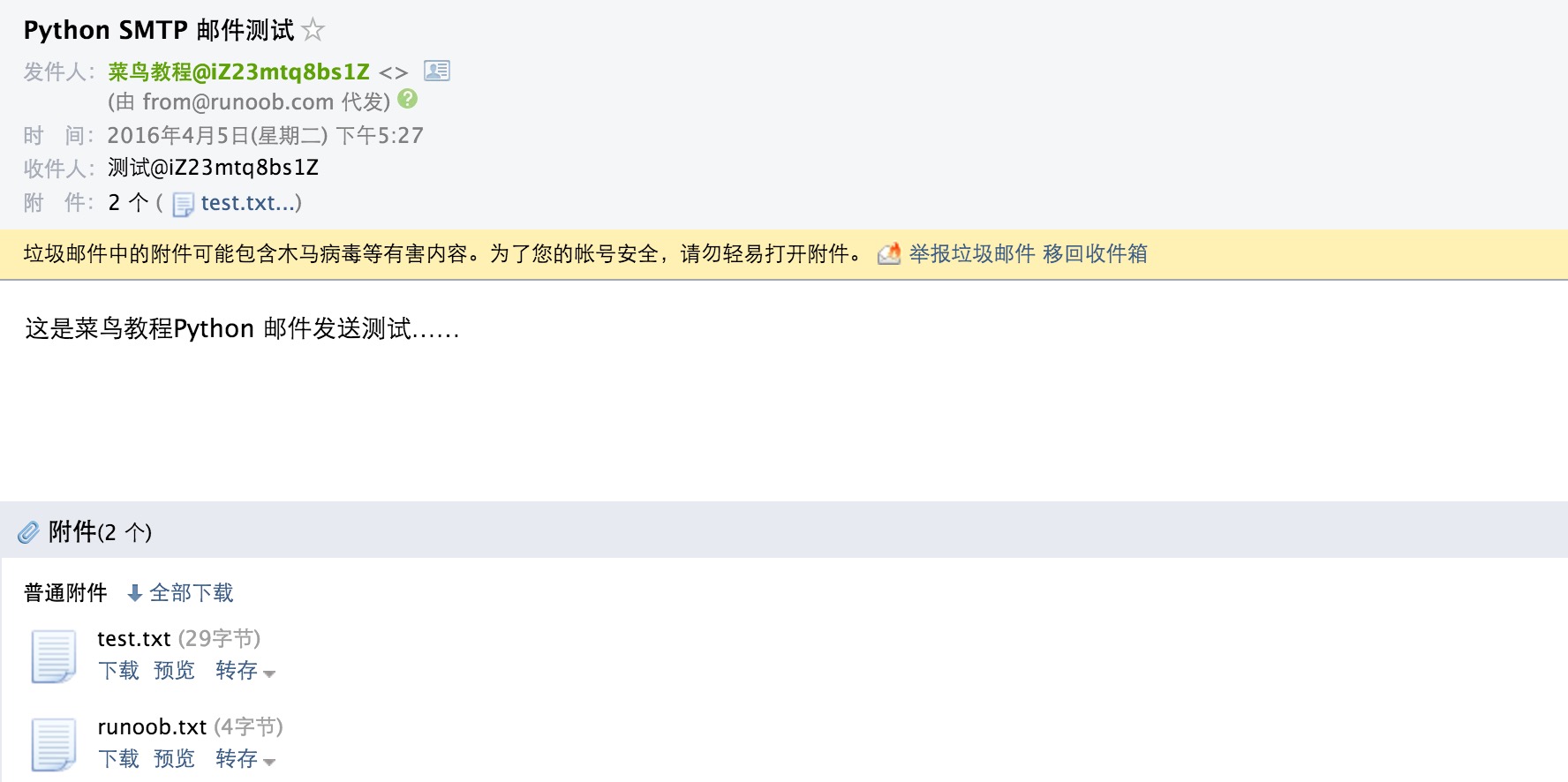 我们通过实例化 smtplib 模块的 SMTP 对象 smtpObj 来连接到 SMTP 访问,并使用 sendmail 方法来发送信息。